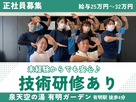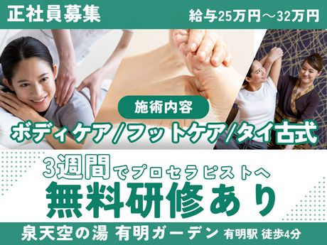 【施術体験・見学実習中!】高級リゾートのような空間で極上の癒しを提供するセラピスト◇泉天空の湯◇有明◇月給25万以上◇駅チカ5分◇充実研修◇